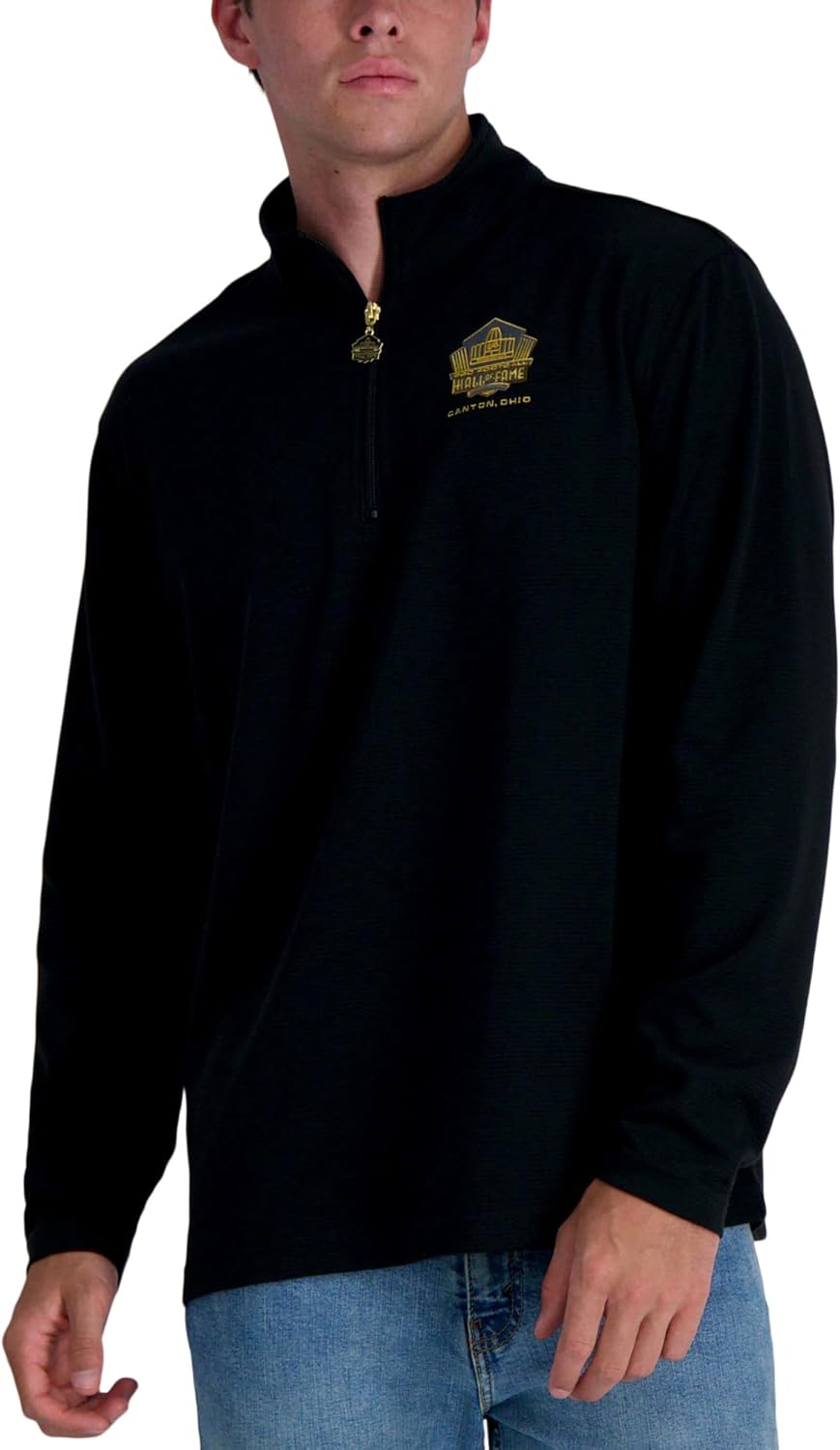 Suit up with the Pro Football Hall of Fame x Haggar collection long-sleeve quarter-zip pullover, crafted in a rugged ribbed stretch fabric. This special edition layering piece, featuring a bold gold and black Hall of Fame zipper pull, brings a touch of gridiron style. With side vents for ultimate mobility and commemorative Hall of Fame packaging, this piece is a must-have collectible for any die-hard football fan.